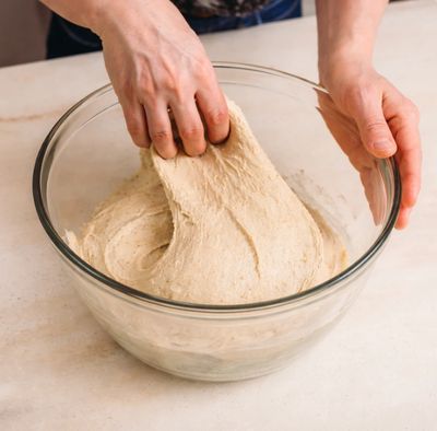 Avec les mains, à même le bol, étirer et rabattre la pâte sur elle-même à 6 à 8 reprises, en tournant le bol de 45 degrés à chaque fois. Cette série de replis se nomme le “stretch & folds”. La pâte deviendra de plus en plus ferme. Couvrir et laisser reposer à la température ambiante.